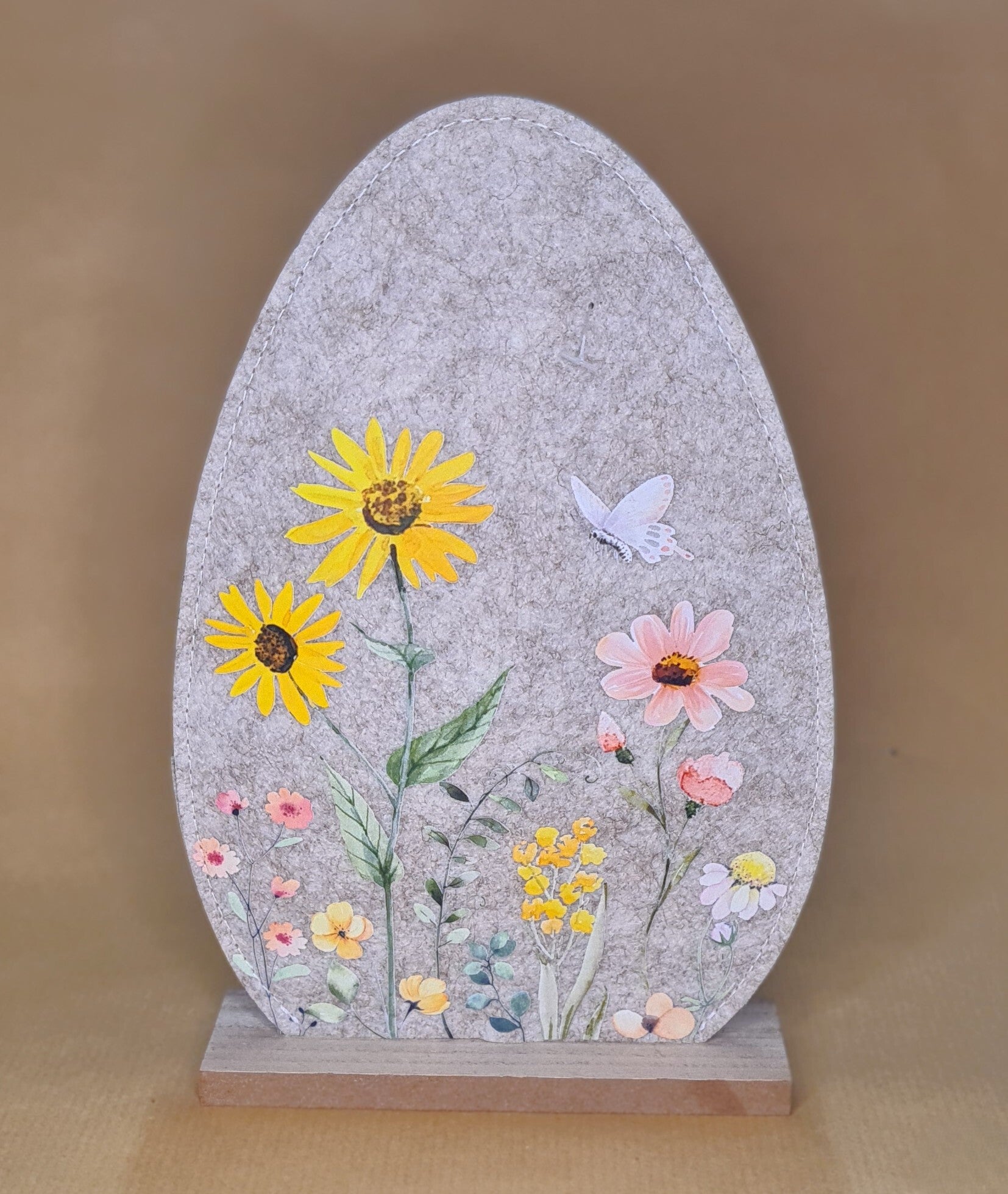 Verziertes Filz-Ei auf Holzsockel