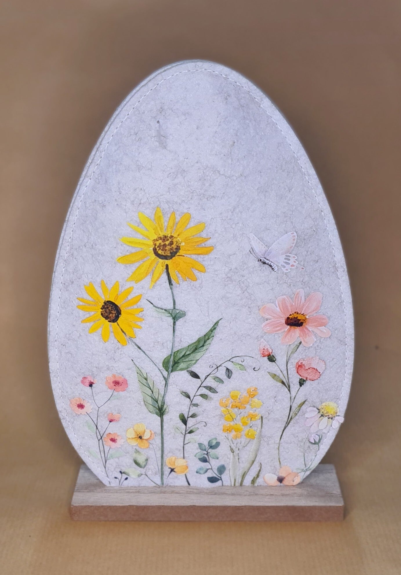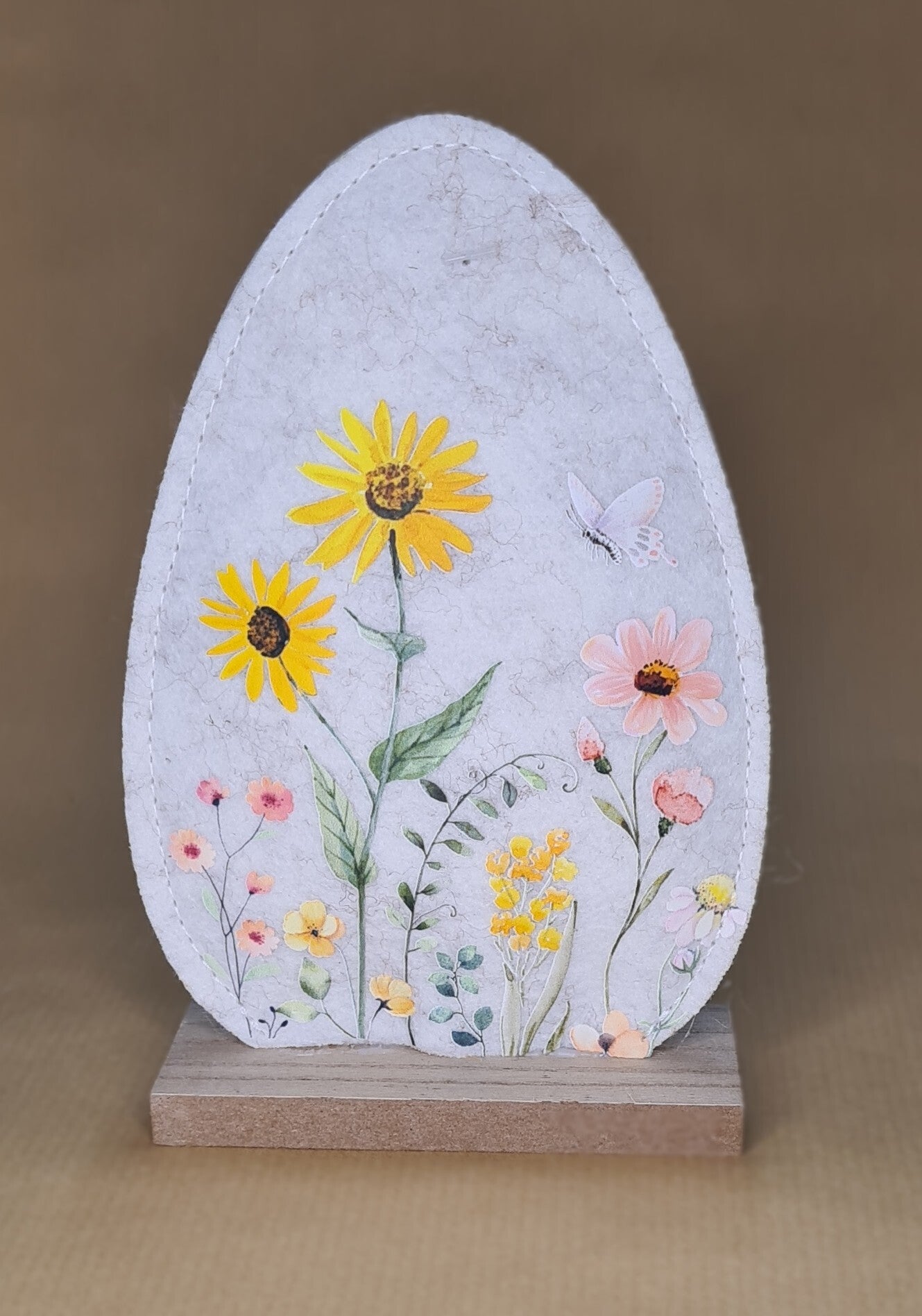 Verziertes Filz-Ei auf Holzsockel